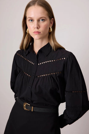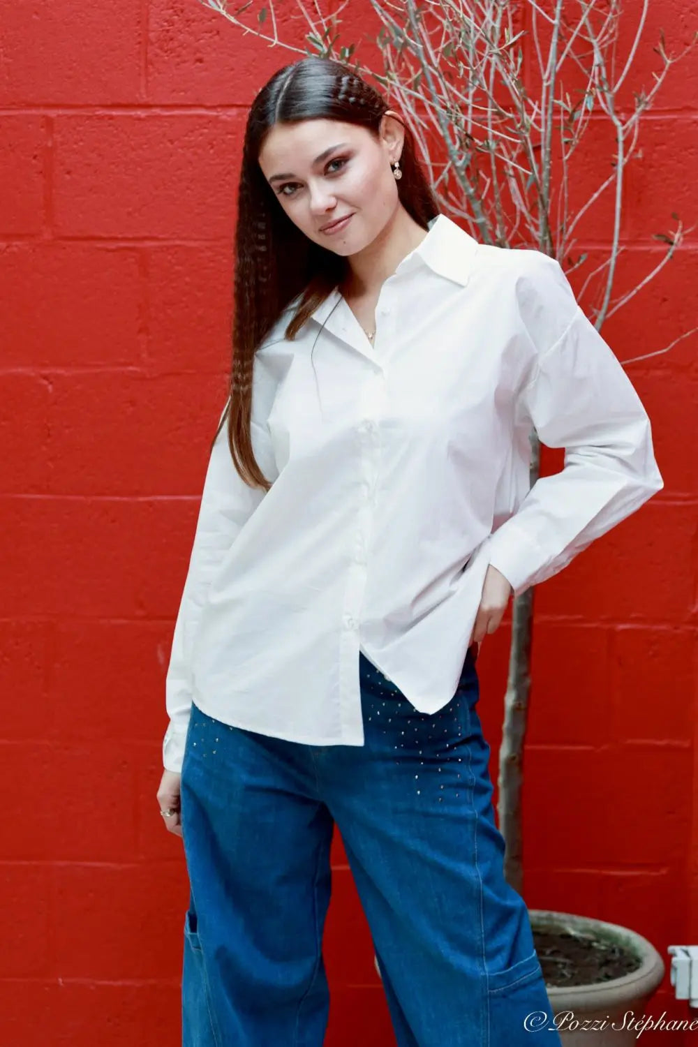 Coupe oversize. 100 % popeline de coton. Fermeture boutonnée sur le devant. Empiècement dos décoré de strass métallisés. Manches longues avec une pince au poignet.