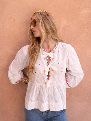 Chemise à col rond et manches longues en popeline de coton, avec broderies et détails fantaisie. Boutonnage à l'avant.