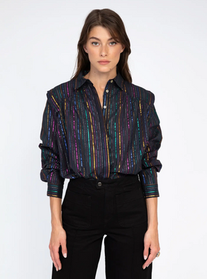 Chemise oversize à rayures verticales bleu et blanc et large bouton doré. Cette pièce allie une coupe classique à une touche avant-gardiste.